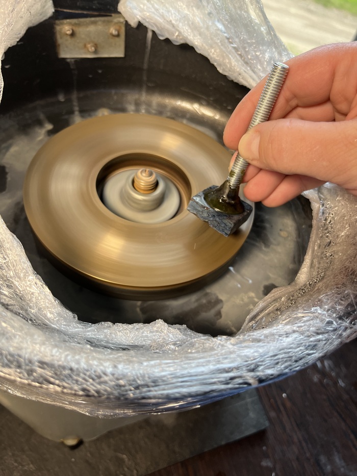 После разметки рундиста мы начинаем задавать нашему камню округлую форму. Здесь нужно быть внимательным, что бы не сточить ничего лишнего. Для удобства я креплю камень специальной мастикой на кич. Таким образом, мне удобнее удерживать камень и появляется возможность более точно контролировать процесс.