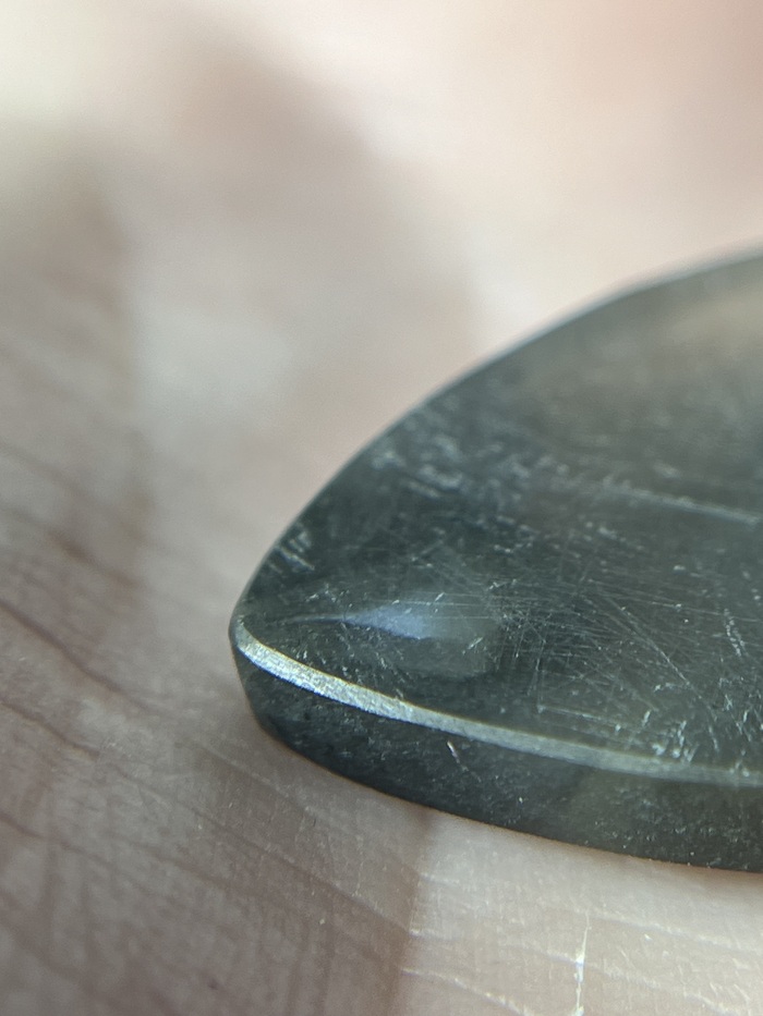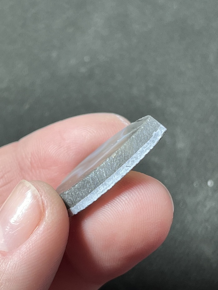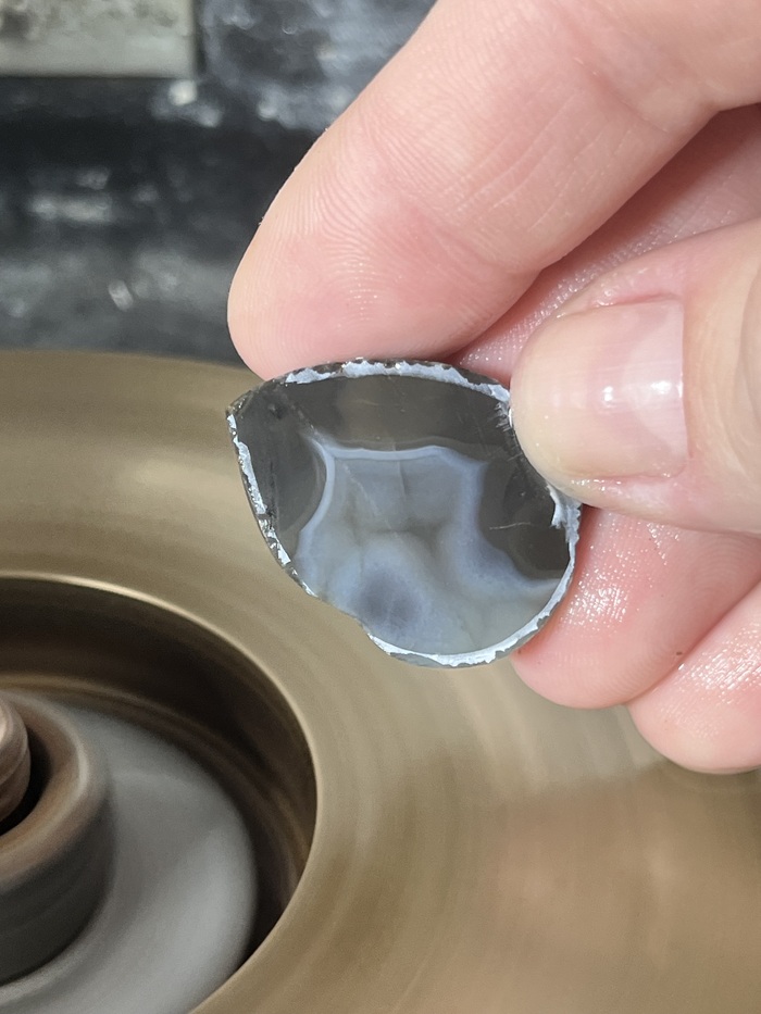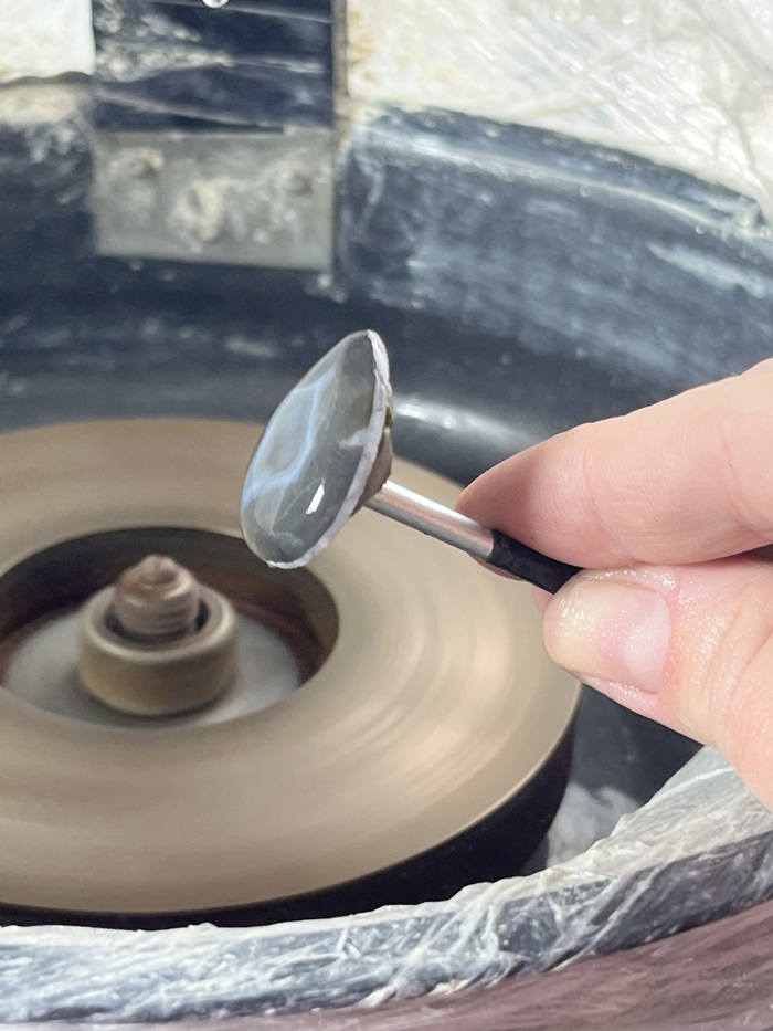 Фаска снимается легким касанием к плоскости планшайбы с постепенным проворачиванием по всему периметру. Если бы камень имел хорошую прозрачность и не крепился бы в глухую оправу, то я бы отполировала и низ кабошона. Соответственно, фаску нужно было бы снимать уже после полировки.
