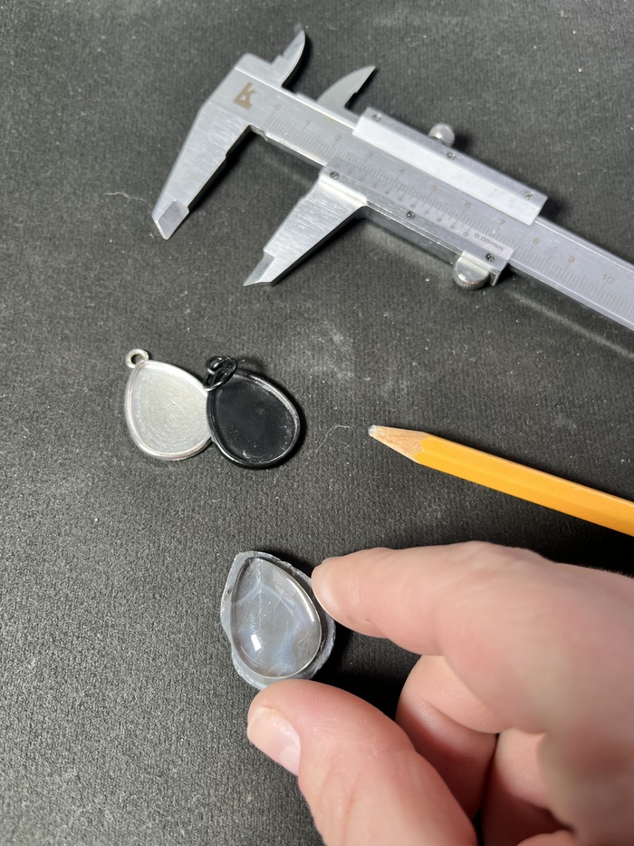 У меня была оправа со стеклянной вставкой. И именно этой вставкой я и воспользуюсь, как трафаретом. На этом этапе мне нужно учесть, какая сторона будет лицевая. А так же учесть все возможные дефекты камня и стараться их обойти.