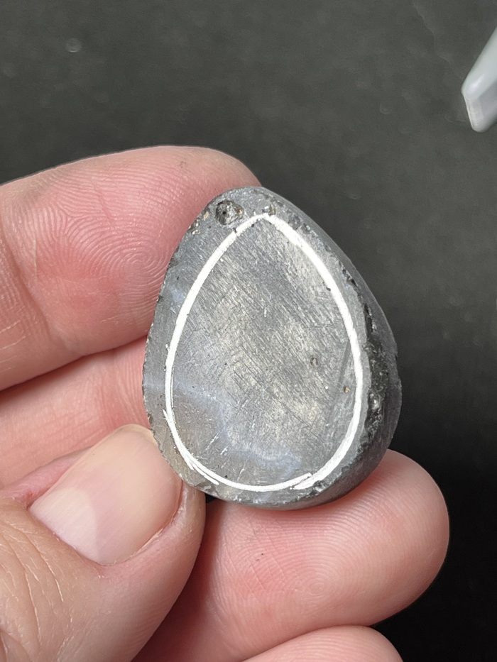 После разметки трафаретом я стачиваю лишнее на самой грубой своей планшайбе. Здесь я не рискнула воспользоваться отрезным диском, что бы не сколоть края моей заготовки. Когда форма подогнана, я примеряю камень в оправу и, убедившись, что все хорошо подходит, делаю маркером разметку для рундиста.