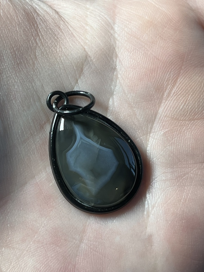 Наш кабошон готов. Сфотографировать одновременно форму, рисунок и его цвет оказалось не простой задачей. Цвет меняется в зависимости от освещения. Так же, как и цвет оправы, меняет внешний вид камня.