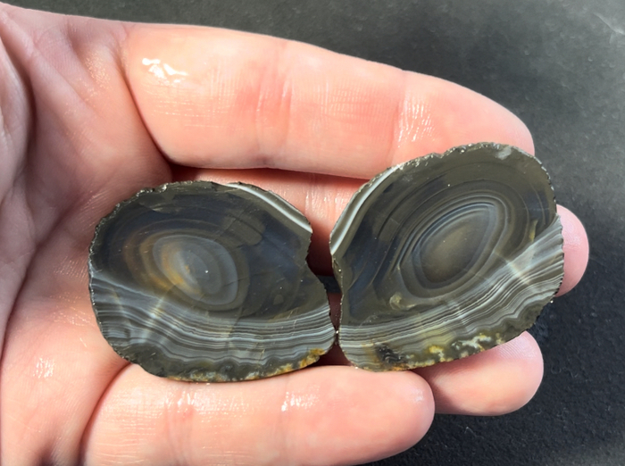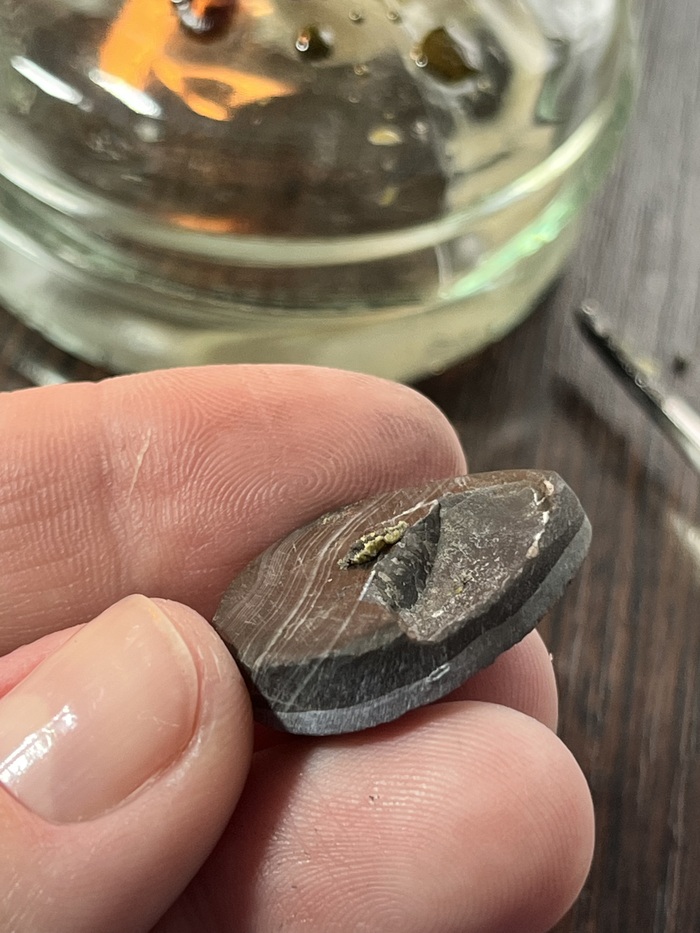 Вот такой рисунок оказался внутри. Не сказать, что я в восторге. Нет каких-то ярко выраженных колец или четкого рисунка. Если вы видели другие мои серии распилов, то должны знать, какими красивыми эти камни могут быть внутри. Но не всем камням быть музейными экспонатами. Для памятного подарка, сделанного своими руками, вполне сгодится.