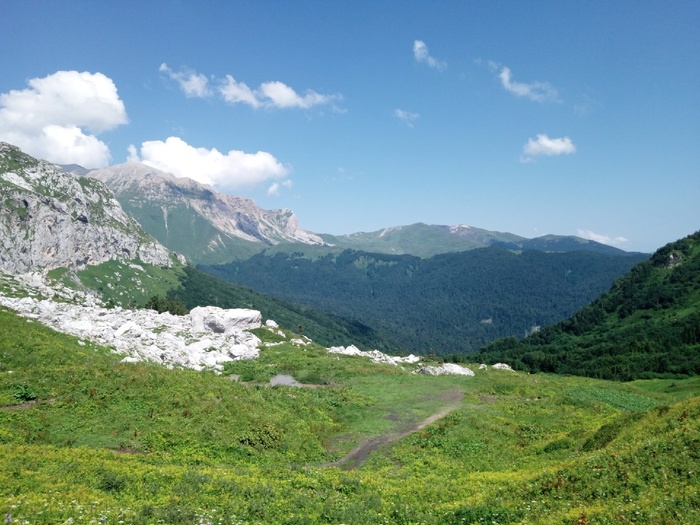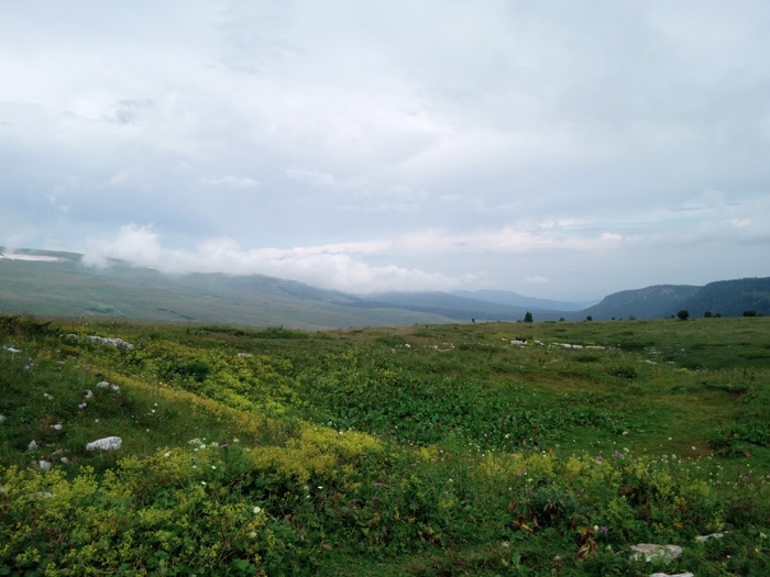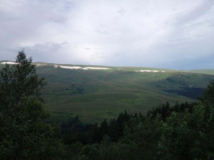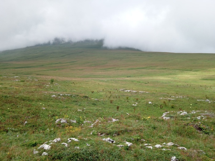 Зарегистрировавшись на КПП Кавказского заповедника мы закинули на плечи наши рюкзаки и отправились в путь уже своими ногами. Но быстро вспомнилось, что мы голодные, последний раз ели в поезде вечером, так что примерно через километр остановились и приготовили завтрак. Дальше вышли на само плато Лаго-Наки, воздух свежий, хороший, пейзажи просто невероятные - зеленые альпийские луга с белоснежными вкраплениями снежников. По большей части плато ходить нельзя - это дом для местных животных , поэтому идем только по тропе. Иногда заходим то ли в облако, то ли в клочок тумана. Странные ощущения, когда идешь по высокогорному плато и облака плывут не вверху, а справа и слева от тебя. Иногда рядом с тропой открывались карстовые провалы, глубокие, одни переходящие в загадочные трещины и пещеры, другие с многолетним льдом и снегом внутри.
