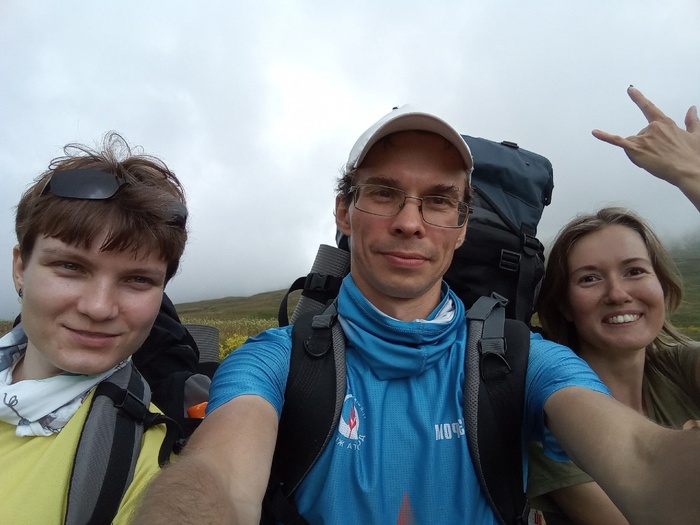 В то утро я еще не снимал ничего, потому что я больше охеревал, чем удовольствие от рассвета получал (пока на нас не упало солнце, мы были как контуженные и медленные, как черепахи). Пока собрали палатки, пока позавтракали сублимированным омлетом и кашей, пока пересобрали рюкзак, пока согрелись, пока... Короче говоря, наши приготовления были ОЧЕНЬ долгими, когда уже все были готовы, мы двинулись на КПП Лаго-Наки. И вот тут я охерел окончательно, потому что я впервые почувствовал в полной мере вес своего рюкзака, а ведь эту дуру еще надо тащить весь путь, но благо в первые дни будет только тяжело, ведь потом еда будет подъедаться и будет полегче (ага, да). Только мы вышли с стоянки, как один из нас включил колонку с музыкой для того, чтобы шугать медведей и увидел молодого медведя, который шарахнулся от нас куда-то в кусты. Наша команда, в общем, была такой...