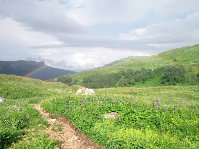 Так с ней и дошли до перевала и стоянки " Инструкторская щель". Она там осталась, решила там остановиться на пару дней и походить в радиалки на легке. Мы пообедали и пошли дальше. Ну и сразу же на перевале поймали дождь. Сильный, с грозой. Но довольно теплый. Ветровки с китайскими мембранами нас условно спасли, а горы по окончании дождя вознаградили нас яркой, близкой радугой. Казалось её можно коснуться рукой. Ясно были видны места, где она касается земли.