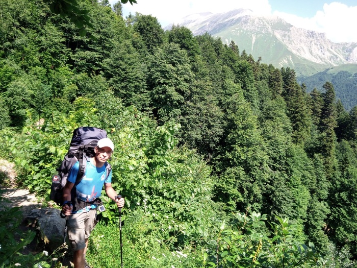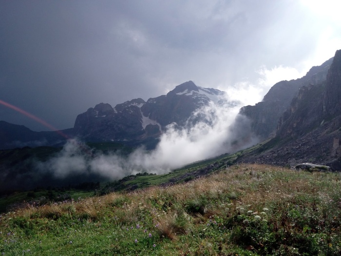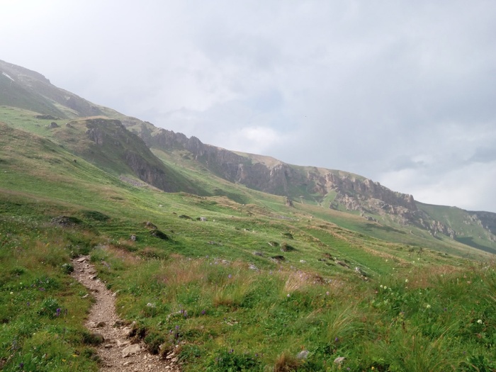 Пройдя по долине и вымокнув под дождем мы вышли на перевал Гузерипль. Алиса осталась отдыхать, я же поднимаюсь к обзорной площадке с великолепным видом на Фишт. Глядя на его суровые склоны, я не могу понять как несколько лет назад мы на него поднимались. А ведь это было. Там же, на этом перевале нам там встретился какой-то подростковый то ли туристический, то ли военно-патриотический клуб, которые потеряли на маршруте большую часть своих. Ну они и расспрашивали нас не встречали ли мы кого на маршруте. Jказалось что нет, не встречали. Дальше шли периодически обгоняя или пропуская кого из них. Один из них поймал лёгкую горную болезнь, мы предложили обезбол и воду, но они отказались. Надеюсь, что потому что у них очень и были, а не из принципа.