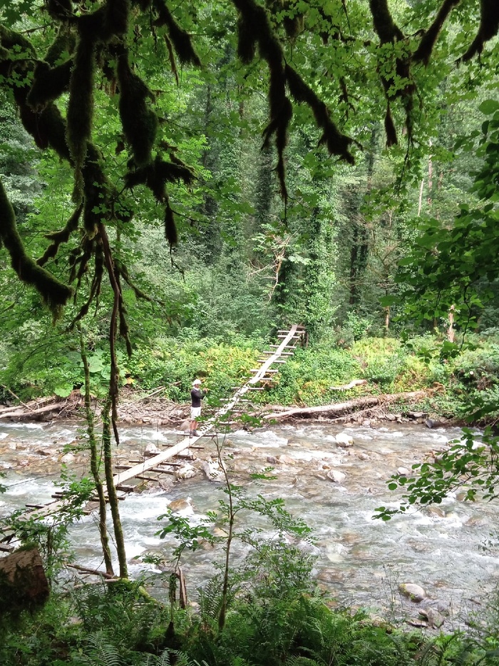 От Бабук-Аула до окончания маршрута, многие нанимают машину. Мы же решили пройтись пешком, и не пожалели. Третий день похода вознаградил нас дорогой по стенке ущелья, с горной рекой с прозрачной голубой водой внизу с одной стороны и стеной поросшей плющом, мхом и лианами с другой. Через реку местами были переброшены тросовые мосты. Переправляться нам было не нужно, но мы не отказали себе в удовольствие пройтись туда-обратно по такому мостику.