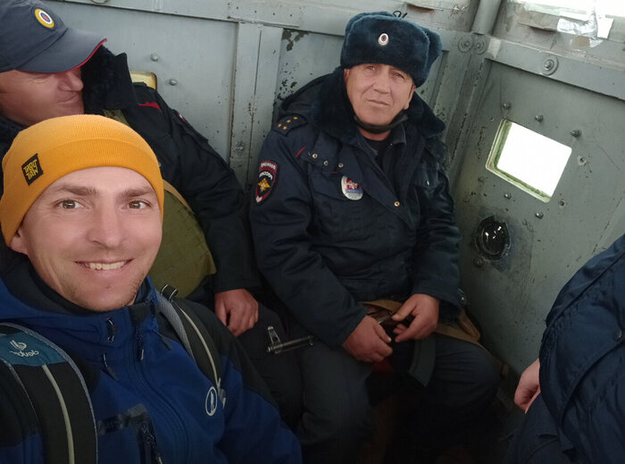 Ни разу не расхераченный покоритель гор среди мешков барахла в ратраке