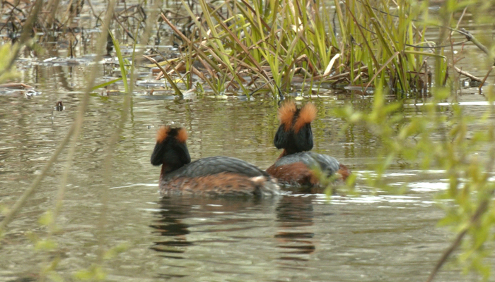 Это не грибы, а очень редкие птицы, занесённые в Красную книгу нашего города. Поганками их назвали за то, что мясо их — невкусное, «поганое»: ведь основная пища этих птиц — рыба, и их мясо, по всей видимости, имеет привкус рыбьего жира.  А «красношейные» они  — потому что передняя часть шеи птиц — красно-каштановая. Весной на голове у них появляются перья в виде раздвоенного хохолка — своеобразные золотистые рожки.  Поганки образуют стабильные пары на весь сезон размножения. Сейчас основная задача у пары — найти на пруду подходящее место для гнезда. Как оказалось, дело это непростое. Кругом конкуренты. Красношейным поганкам постоянно мешают строить гнездо агрессивные лысухи. Местные жители каждый год переживают за поганок: смогут ли они вывести потомство? Ближе к вечеру я стал свидетелем того, как парочка наконец-то нашла себе не занятое лысухами место и сразу же начала строить семейное гнёздышко. Пожелаем им успешно стать родителями!
