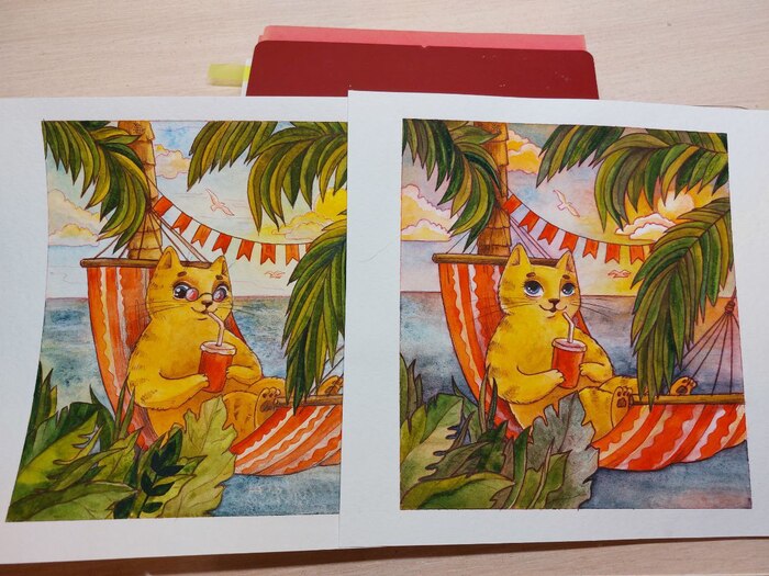 В прошлое воскресенье я нарисовала балдежного кота в гамаке. Я была очень довольна, пока не пригляделась к морде персонажа.. "Да у него ж глаза непропорциональные! Какая глупая морда вышла!" - подумала я, и предприняла попытки хоть что-то исправить. В какой то момент меня посетила гениальная (нет) идея пририсовать очки - они должны были скрыть ошибки моих трудов, но как не трудно догадаться - стало хуже.