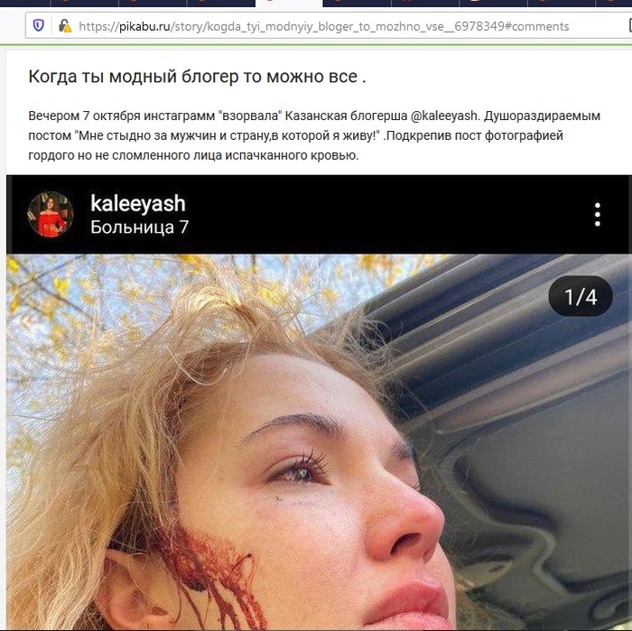 Вечером 7 октября инстаграмм "взорвала" Казанская блогерша @kaleeyash. Душораздираемым постом "Мне стыдно за мужчин и страну,в которой я живу!" .Подкрепив пост фотографией гордого но не сломленного лица испачканного кровью.