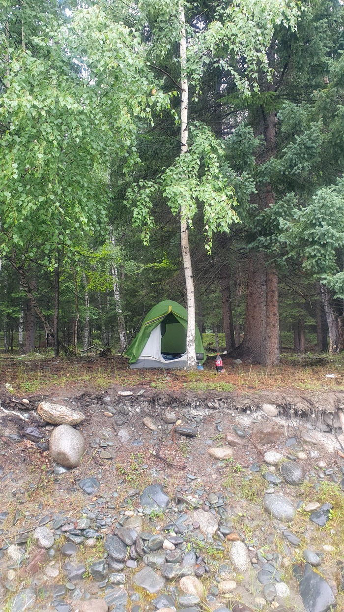 Переночевал по пути на Рахмановские ключи на берегу речки. Ночь и утро шёл дождь, и судя по небу, стало понятно, что ясной погоды в горах не ждать этот день. Топать в дождь и не увидеть Белуху даже с Рахмановского озера - перспектива такая себе. Забил и на это озеро, и повернул назад в сторону староавстрийки.