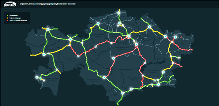 Через Казахстан проходят пять международных автомобильных маршрутов общей протяженностью 23 тыс. км. Это автомагистрали Нур-Султан (Астана) – Алматы (трасса М-36) с выходом на Челябинск, Алматы – Петропавловск (?) с выходом на Омск, Семей – Майкапшагай (М-38) с выходом на Омск, Алматы – Шымкент (A-2) с выходом на Ташкент, Шымкент – Актобе – Уральск (М-32) с выходом на Самару.
