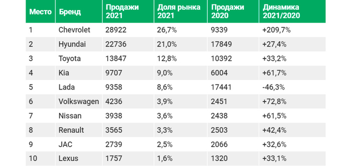 Прошедший год изменил позиции в рейтинге самых продаваемых автомобилей. По итогам 2021-го в лидеры выбился бренд Chevrolet с результатом 29.112 проданных автомобилей (+190,3% к предыдущему году). На втором месте Hyundai с реализацией 22.736 автомобилей (+27,3%). Замыкает первую тройку Toyota, дилеры который продали 13.847 автомобилей (+32,6%).
