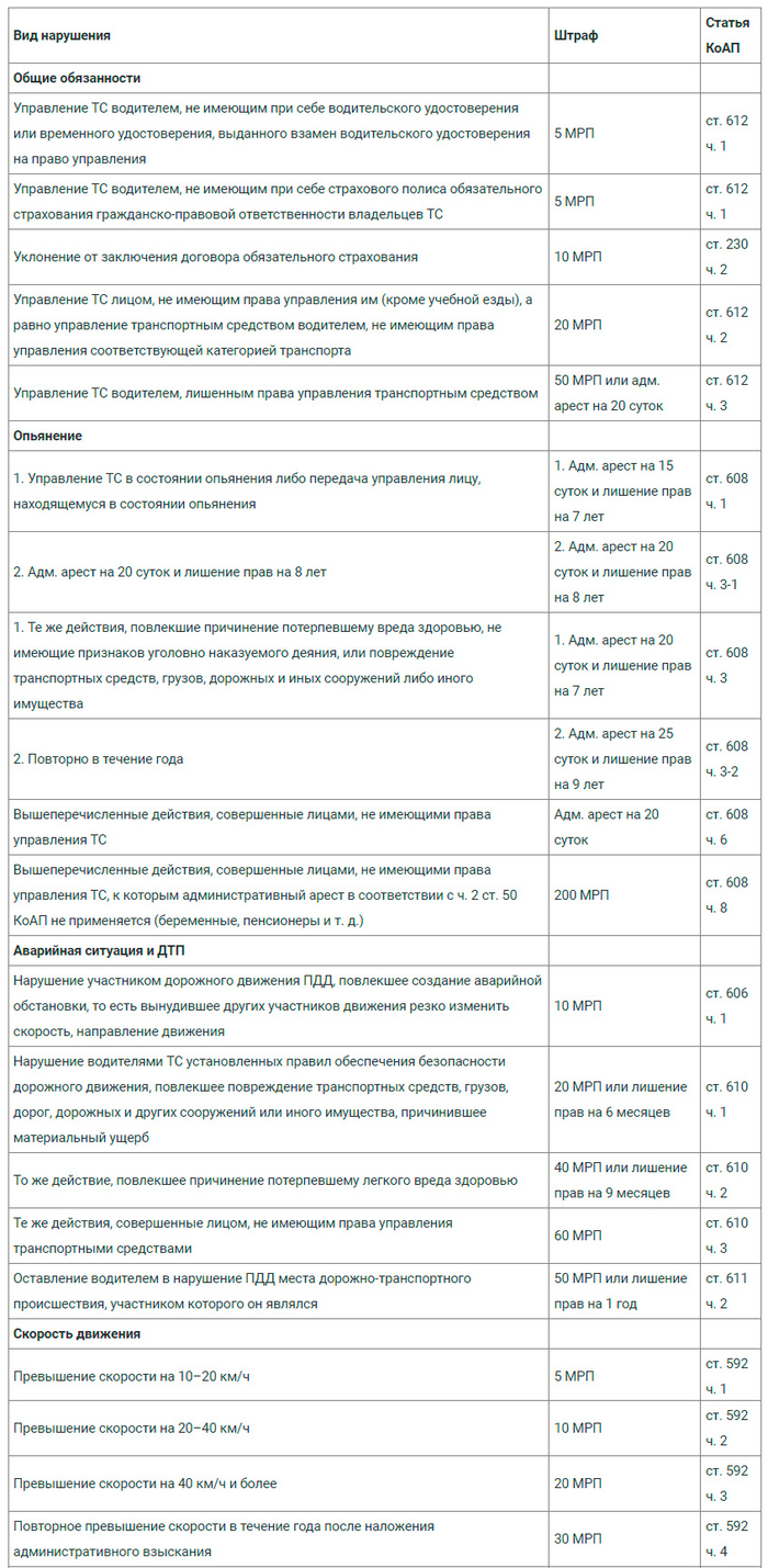 Представление о наказании за наиболее распространенные нарушения можно получить из следующей таблицы: