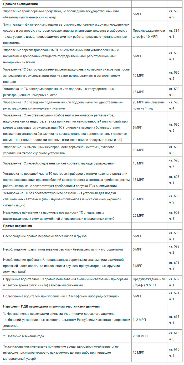 Разговор по телефону за рулем (5 МРП) теперь карается штрафом в 15.315 тенге; проезд на красный свет светофора (10 МРП) – в 30.630 тенге; езда по пешеходным дорожкам, обочинам или тротуарам (15 МРП) – в 45.945 тенге.