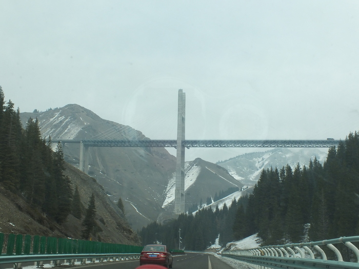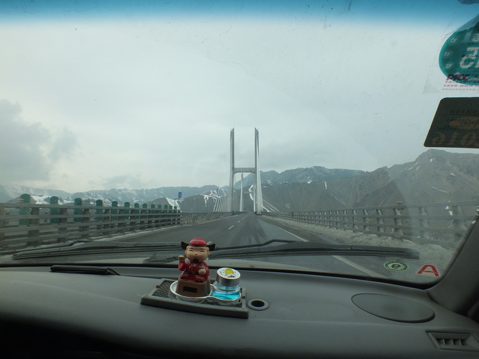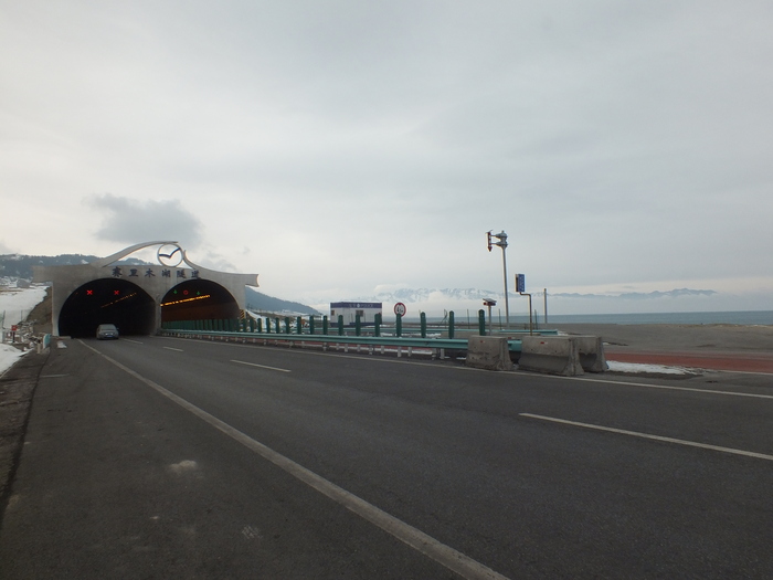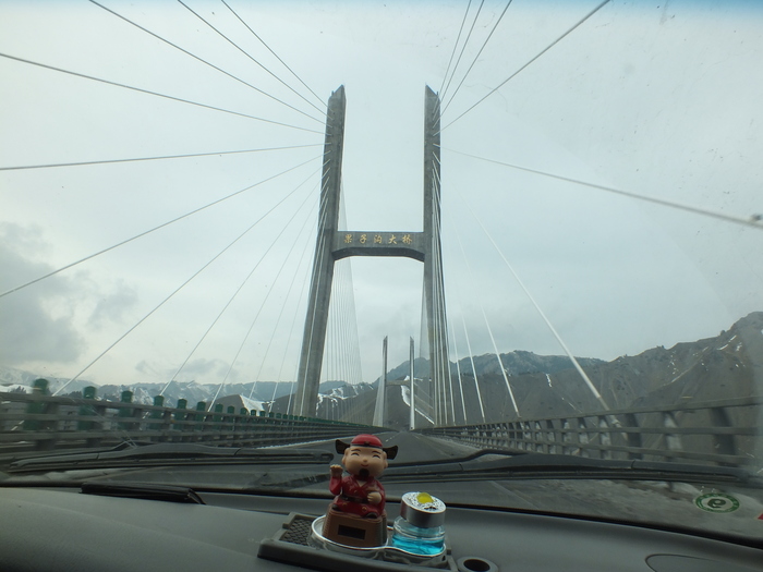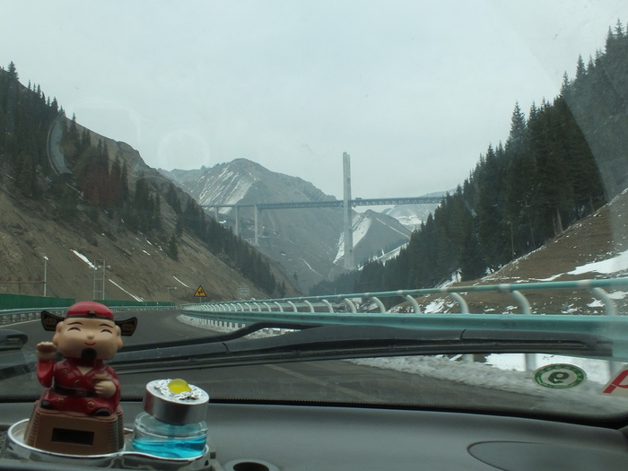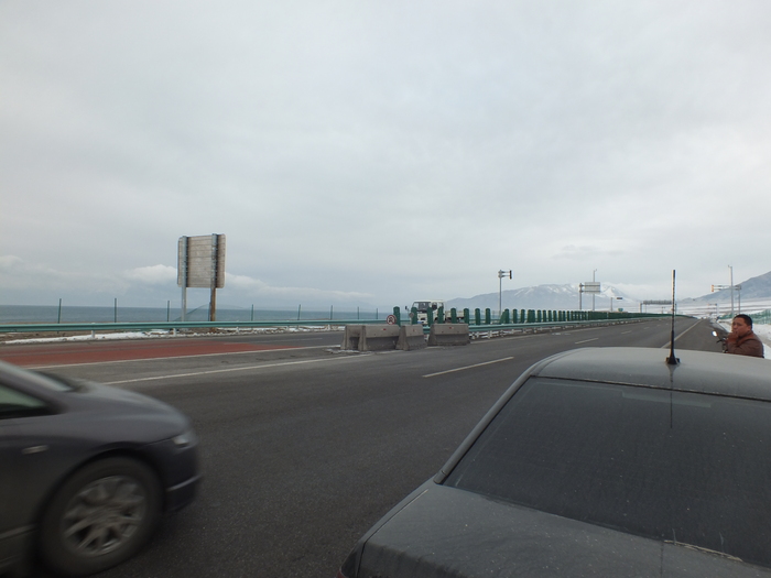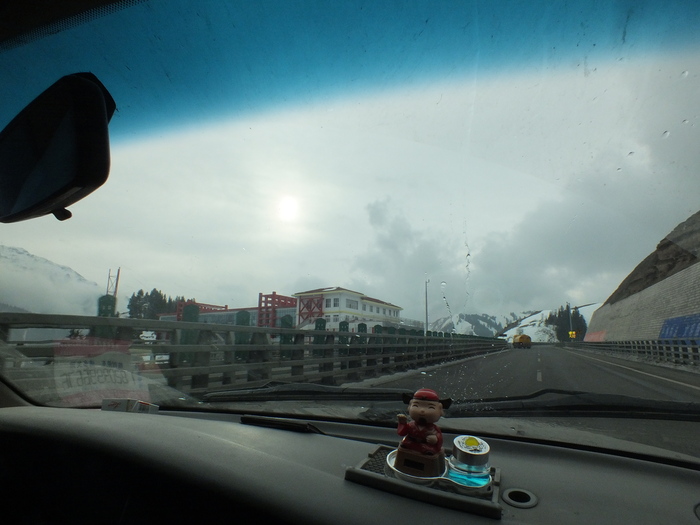 Без денег, значит без денег. Выбираемся на трассу, не зная как отвечать куда и что нам надо. Пробуем общение через гугл-переводчик, пока подбираем фразы, коммуницируем с 6-7 водителями. Точнее, пробуем коммуницировать, впадая в меланхолию от внезапно кончившейся легкости общения в странах СНГ. По дороге бегают беспечные пекинесы, одного из них сбивают на наших глазах.. Наконец, уезжаем с выдержанно-стильным китайцем, раскатисто смеющемся своим же непонятным словам. Первые километры китайских ровных дорог, развилка, и почти сразу уезжаем с другим водителем. Долго едем через перевалы, горное озеро, иногда останавливаясь по инициативе водителя для фотосессий.