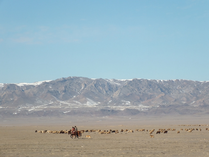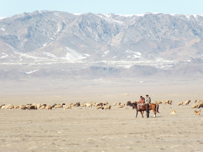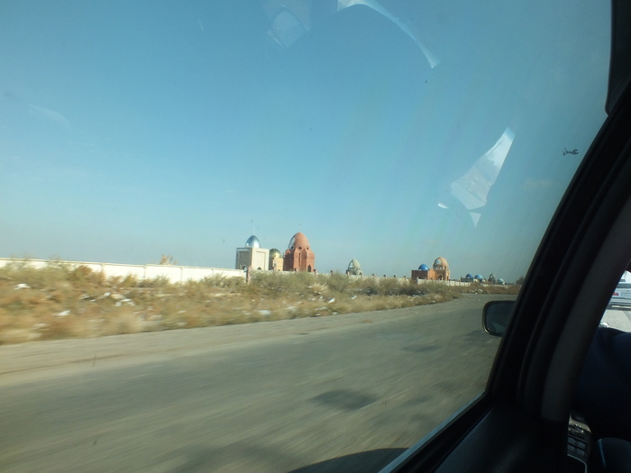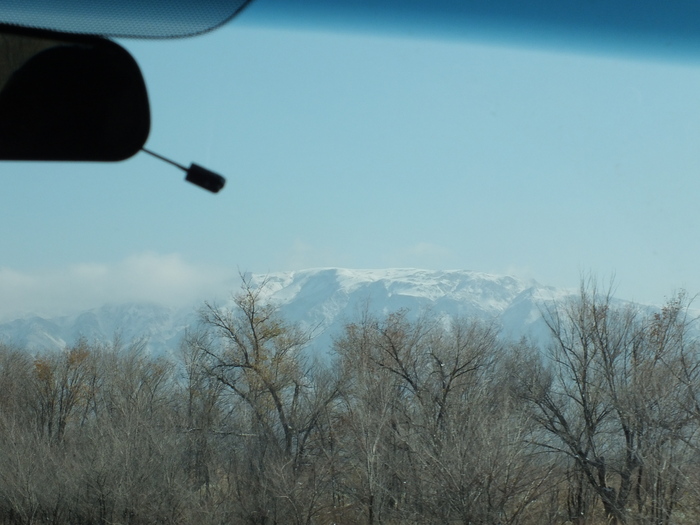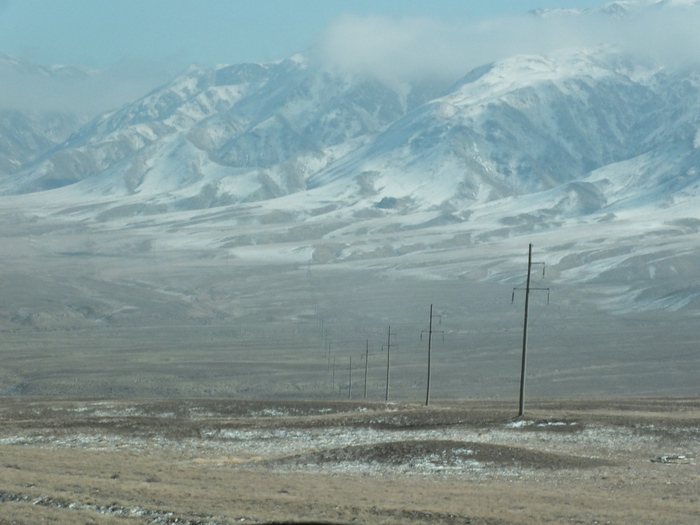 Погода солнечная, снег постепенно исчезает и мы снова попадаем в золотую осень. На небольшом базарчике дегустируем кухню, наслаждаясь теплом солнца и запахами вокруг после очередного побега из зимы. Доезжаем до гор - красиво! Дорога петляет, подставляя окнам различные ракурсы пейзажей. Выезжаем на просторы степи, окаймленные грядой вершин в снегах.