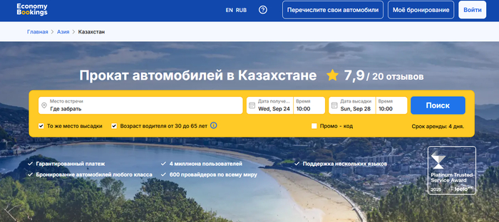 EconomyBookings — мой «рабочий конёк», когда важны цена и охват по городам. В Казахстане он помогает поймать хорошую ставку как в крупных аэропортах (Алматы, Астана), так и у локальных прокатчиков, которые не всегда представлены у конкурентов. «Экономия — это про компромиссы?» — не обязательно. Если бронировать заранее и смотреть на классы пониже, можно выхватить отличные условия без ощущения «срезали всё, что можно».