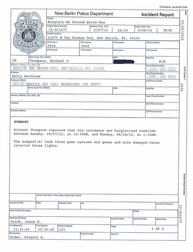 Второе открытое дело - 2012 год, на тот момент 18-летний Гайдж пробирается в квартиру некоего Майкла Томпсона, крадёт три игровых приставки и разбивает освещение в квартире: