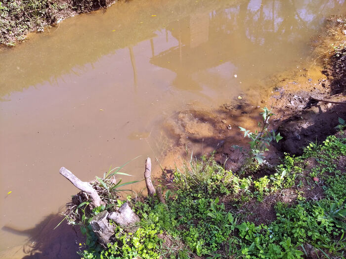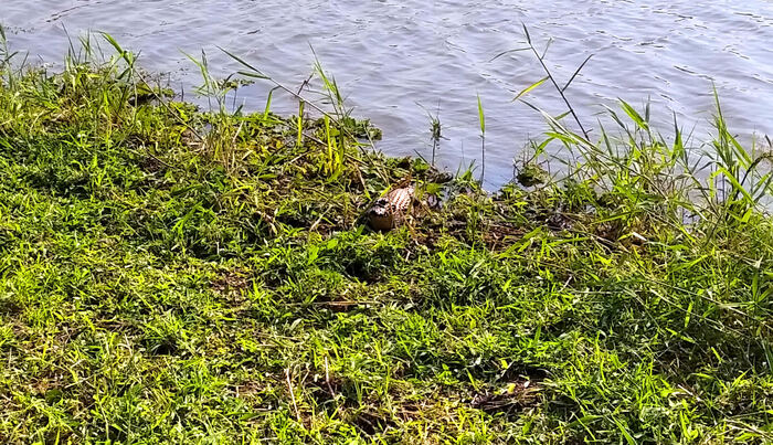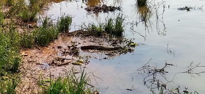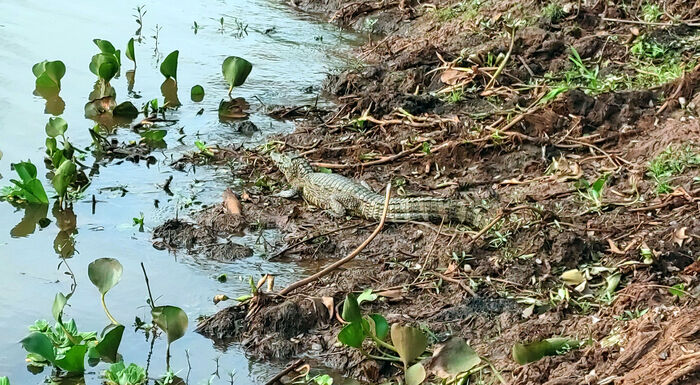 Я сначала подумал, что это какая-то шутка, чей смысл от меня ускользает. Какие крокодилы? Я буквально нахожусь в центре города. Но повинуюсь предложению моих новых знакомых, поворачиваю голову и... да. Лежит. Нежится на солнышке. Правда не крокодил, а маленький кайманчик. На фоне берега его плохо видно, я бы даже его и не заметил. Фотать с места, где стоял, бессмысленно: у меня не такая хорошая камера на телефоне. Поэтому пытаюсь подойти ради хорошего кадра, но у рептилии были другие планы, и она уплывает от меня. Даже хвост не попал на фото :-(