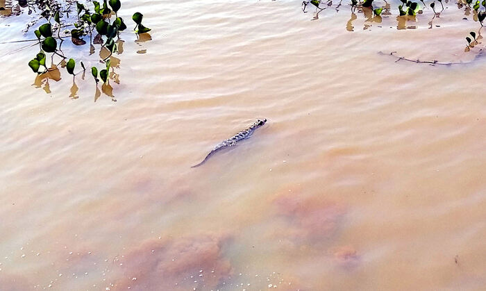 Я запомнил место встречи с "грозным хищником", и вернулся туда же в то же время на следующий день. В этот раз встретил целых 4 каймана. Все маленькие, но фото получились получше. Хотя все еще есть куда стремиться.