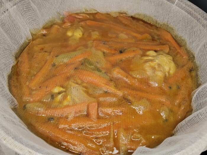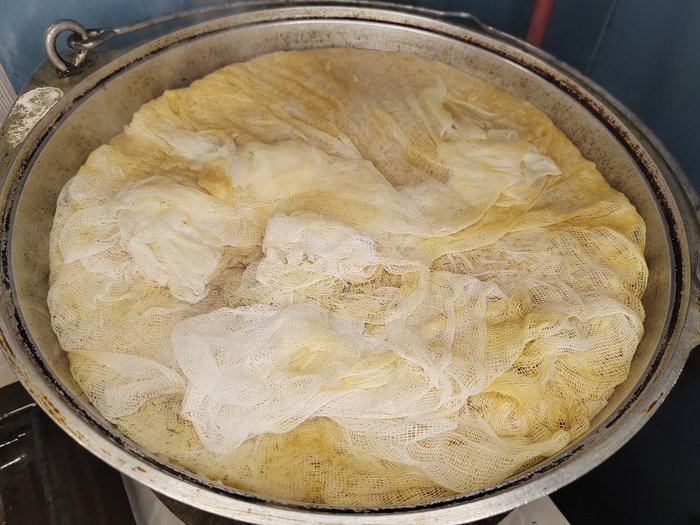 21. После сделаем странное - начнем варить марлю. Или готовить плов с марлей. Или и. В общем, накроем зирвак слоем марли. Следим, чтобы марля внезапно не загорелась. Жидкости в казане останется ещё довольно много - так и должно быть.