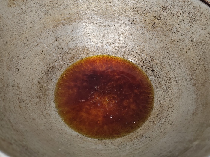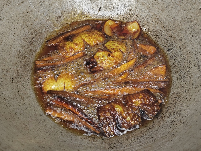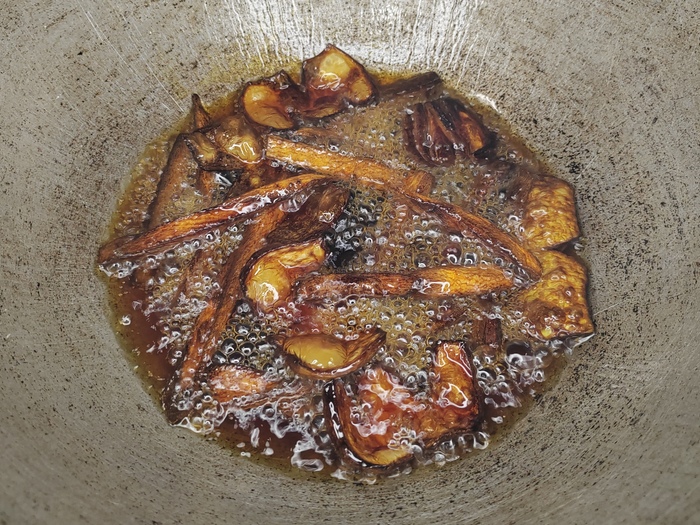 8. Нафиг всё это кремируем. Не то, чтобы прям до состояния деактивированного угля, но почти. Это нужно для того, чтобы убрать неприятную часть запаха зигира, ну и заодно добавить в масло луково-морковного запаха.