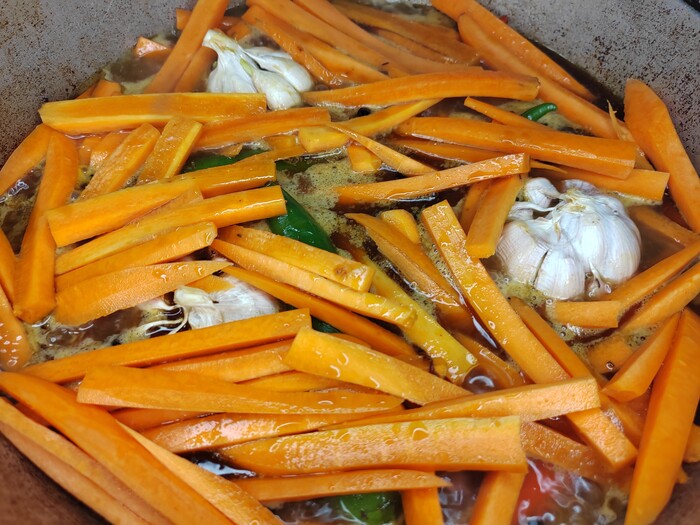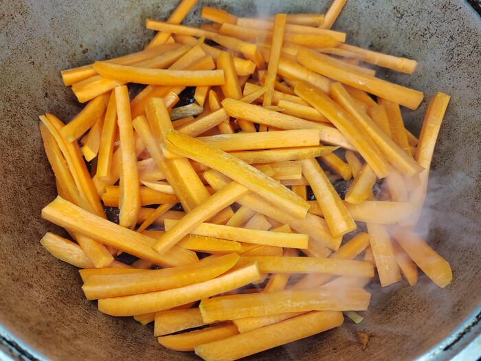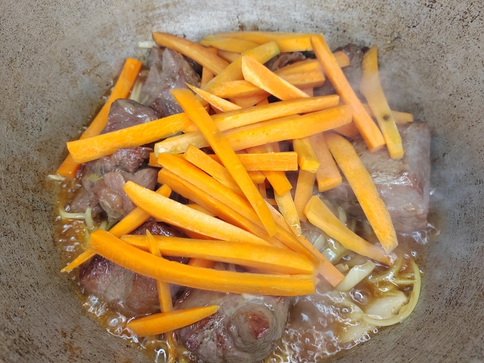15. Убавим огонь до минимума. Выложим на мясо половину оставшейся моркови.