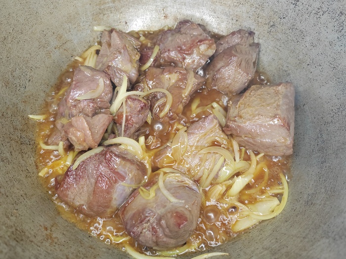 В других пловах такой цвет может появляться из-за большого количества очень хорошо обжаренного лука, но и лука здесь совсем чуть-чуть.