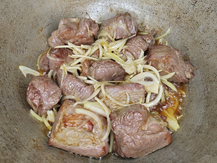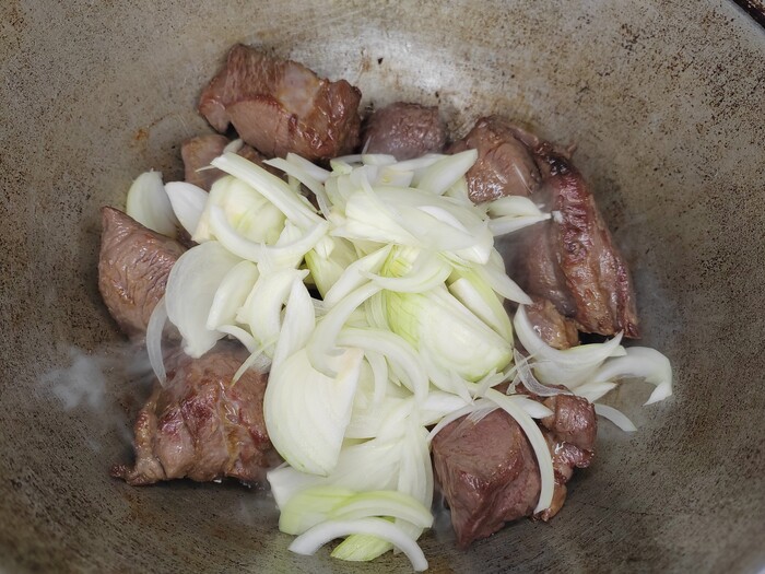 7. Разогреем масло почти до дыма и кинем в него непорезанный лук и немного моркови.