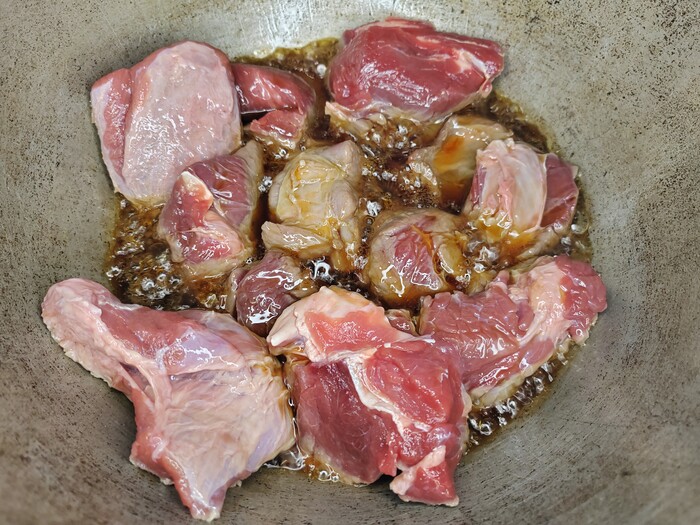 14. Кинем в мясо жменьку морквы (небольшую. Для сладости), перемешаем и ещё пять минут пообжариваем.