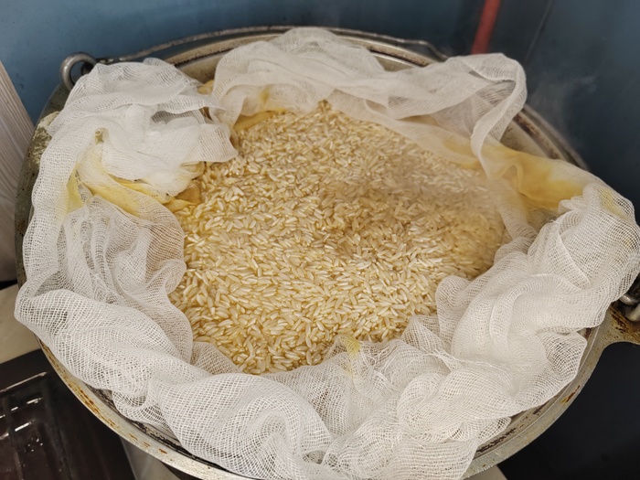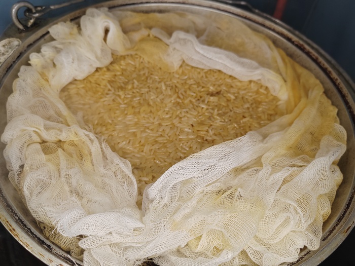 22. Выложим рис на марлю. Утрамбуем его, ненадолго сделаем огонь сильным, чтобы весь жырчик оказался сверху.