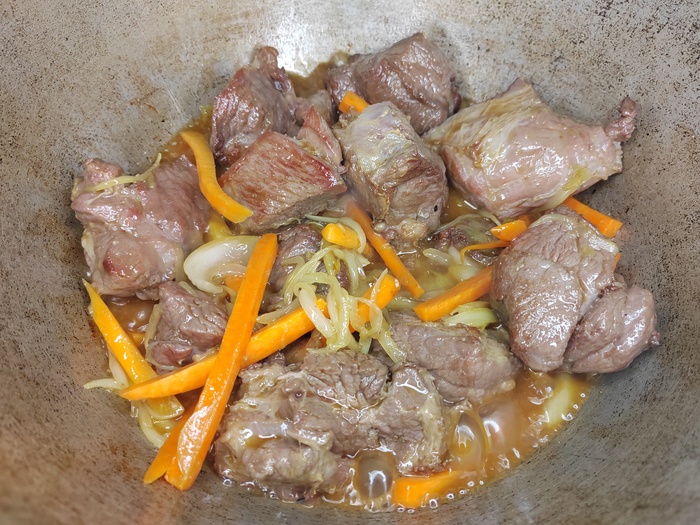 Ещё одна интересная особенность этого плова - это его ультимативная (для среднеазиатских пловов) слоёность. Даже какого-то классического зирвака не варится. А рис готовится, буквально, в отдельном "мешке". Не обязательно, конечно, но отчасти так проще.