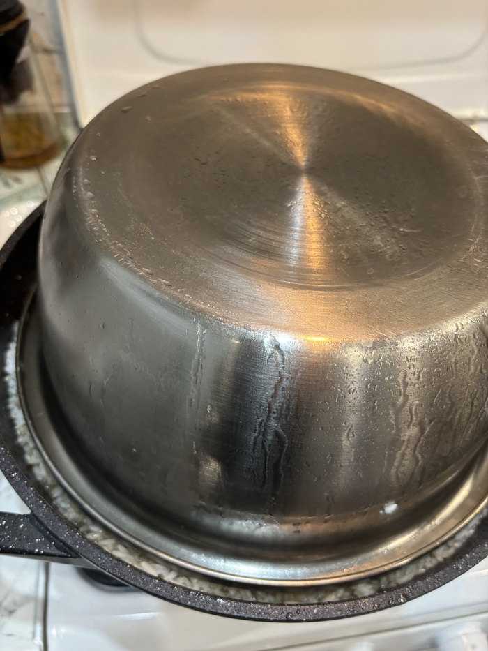 Чтобы получить нужно в достаточно большой объем раскаленного масла положить такой объем мяса который значительно не снизит температуру масла, зачем это? если мы в раскаленное масло внесем много мяса то она снизит температуру масла и жидкость из мяса успеет выделиться из мяса до того как раскаленное масло его запечатает внутри, будет смесь жидкости и масла которую как не старайся не нагреть до нужной температуры. Отсюда важна форма казана как часть сферы, не пойдет посуда с плоским дном будет либо много масла либо много мяса. Алюминий не распределяет тепло по всех поверхности казана, части его остаются недостаточно нагретыми, тут если делать все верно либо пригорает где-то либо недоваривается.