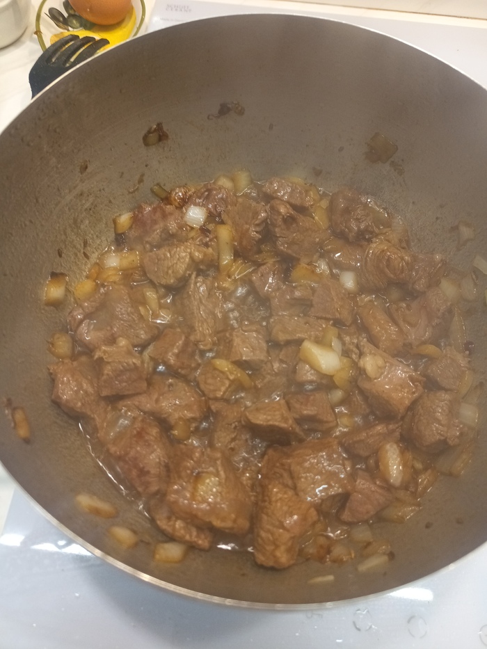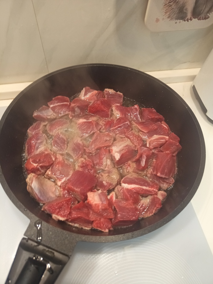 Начинаю готовить зирвак, на первом этапе будет использоваться сковорода для обжарки мяса, далее переместим все в кастрюлю. разогреваю масло на максимальном огне, и начинаю обжаривать говядину.