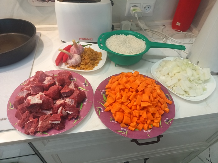 Возникла острая необходимость поесть плова, поэтому после работы заскочил в магазин и приобрел все необходимые ингредиенты, обычно плов рекомендуют варить по формуле, 1 1 1 то есть, 1 часть мяса, 1 часть моркови и 1 часть риса. Но я люблю что бы мяса было побольше и поэтому у меня будет килограмм говядины, килограмм моркови, и грамм 700 риса. Так же у меня будет грамм 500 лука репчатого, 2 головки чеснока, пара перцев чили, 100 грамм изюма.