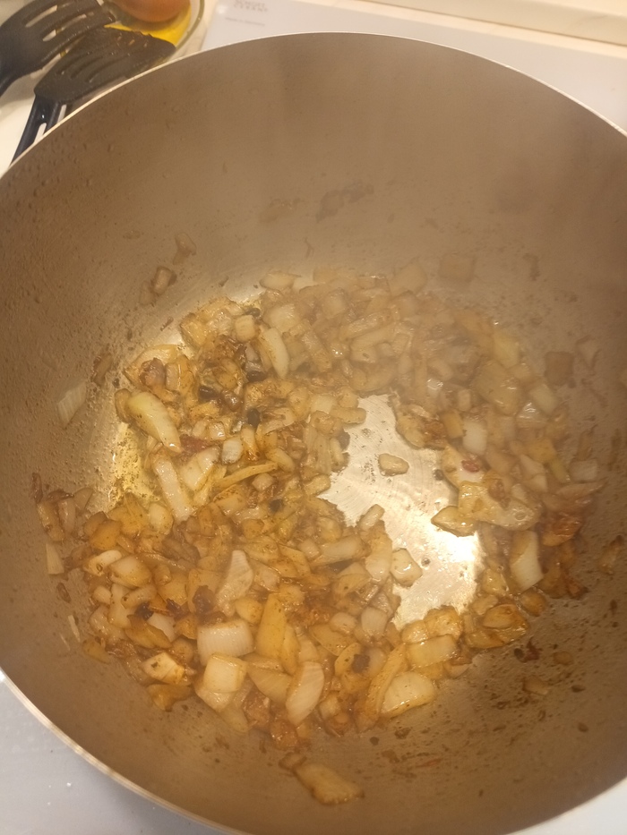 Параллельно в кастрюле обжариваю лук, до золотистого цвета, я добавляю специи на разных этапах, по чуть чуть, что бы все пропитывалась обменивалось вкусами.