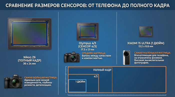 Для справки, то вот сравнение дюймового сенсора с фотокамерами: