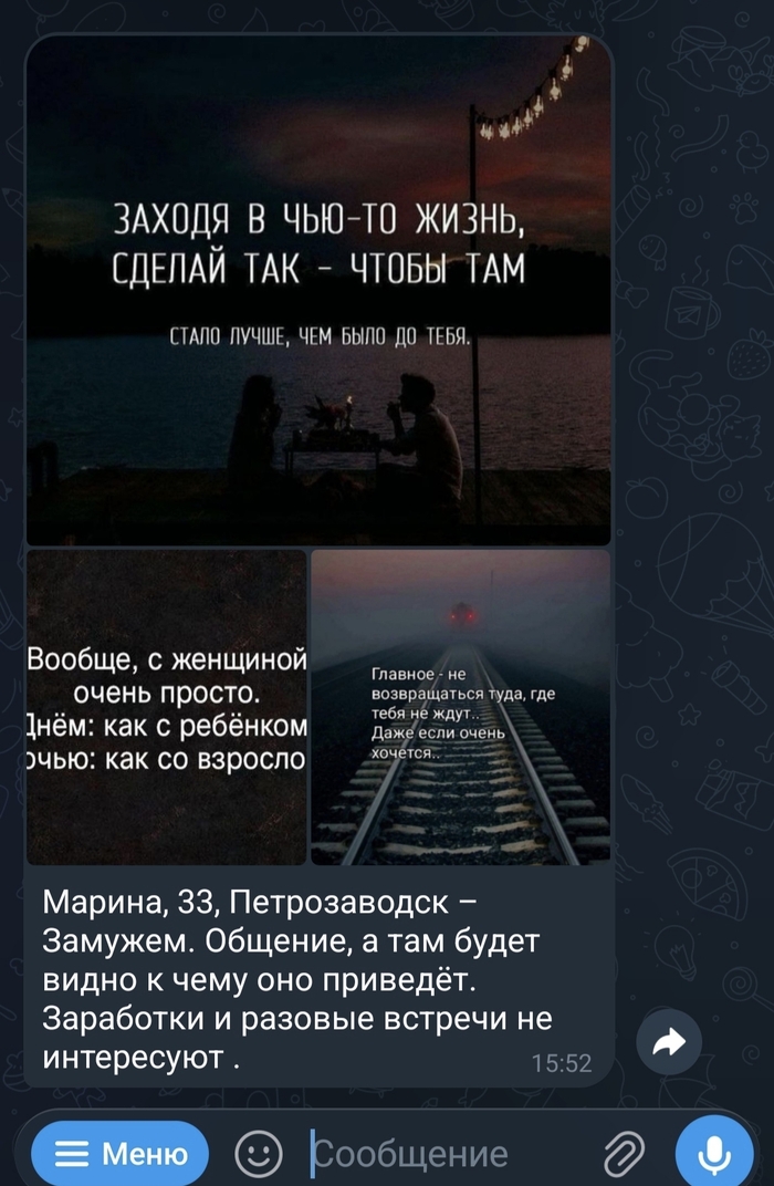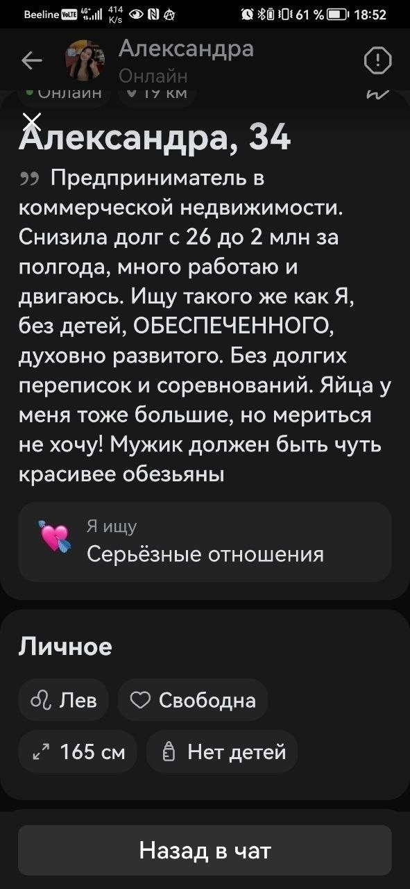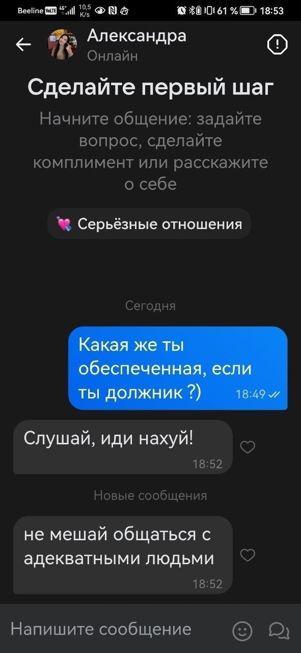 Если девушка адекватная, то на СЗ она найдет норм вариант за неделю-две. В провинции за месяц быть может. Все эти любительницы годами сидеть на сз - это зачастую либо бляди, либо корона на голове, либо обладательницы избегающего типа привязанности. Развлекать их - себе дороже.
