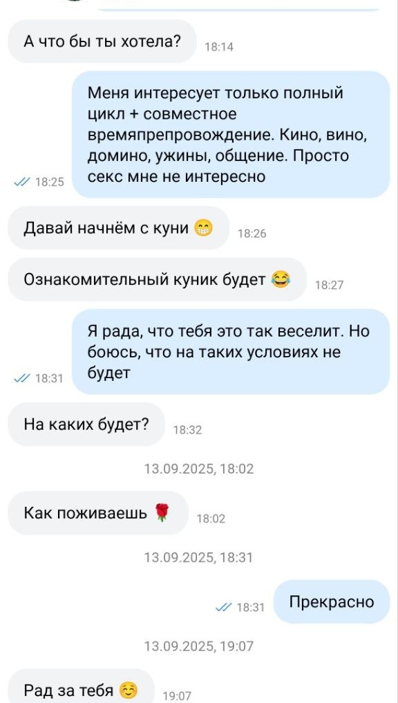 Вот вообще ни когда ничего не слал, и не просил. Ни когда не делал эротических фото и прочее. И вообще не понимаю, зачем люди это делают? Так что для меня это "рэд флаг".