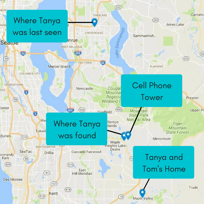 Согласно этим данным, последний сигнал телефона Тани был зафиксирован в радиусе 2-х миль на той самой дороге, по которой ездит Таня из магазина "Тэд Маер".