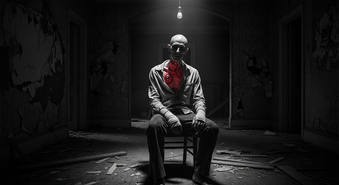 Внутри всё было не лучше, чем снаружи. Пол в щепках, обои клочьями, и вонь плесени на весь дом. Но передо мной сидел костлявый лысеющий мужик, вцепившийся в свою правую руку, которая была замотана бинтами. Он сидел на деревянном стуле, бледный, с черными кругами под глазами, а на лбу выступили капли пота.