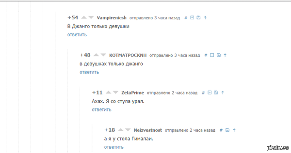 1 DeadRogue 11 лет назад Когда комментарии смешнее поста к посту #comment_34302911 Джанго Как увеличить член Освобождение