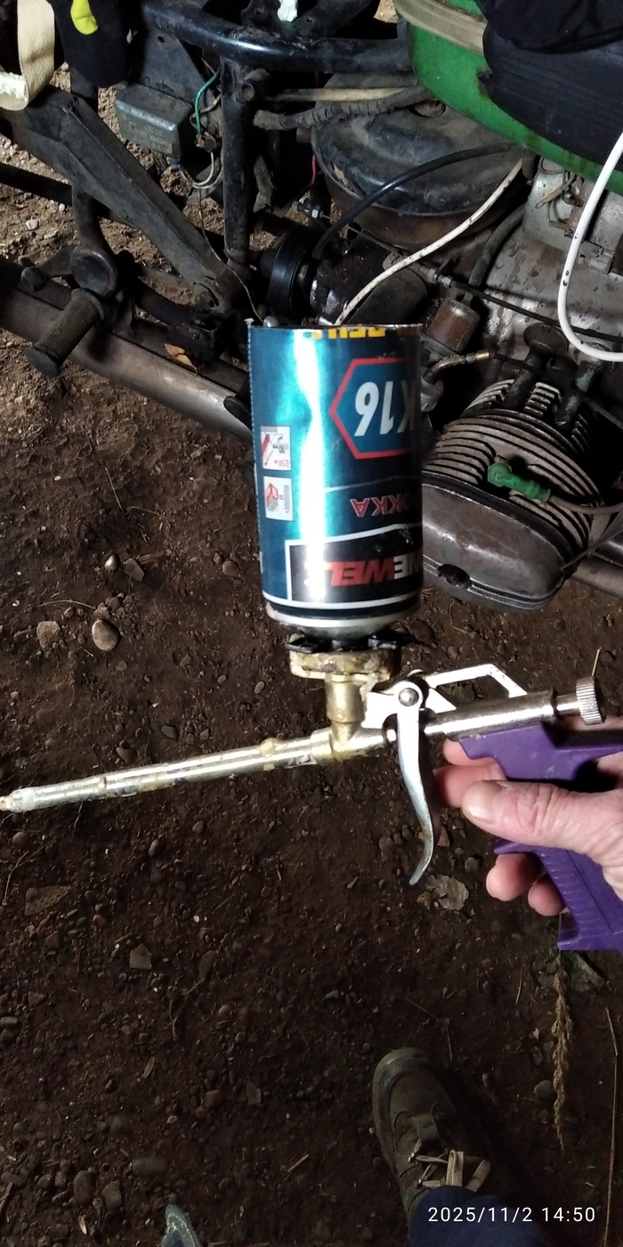 А на сам пистолет сделал просто. Отрезал старый баллон от пены. Выбил клапан. Клапан на пистолете давно выбил, клинило его. Закрутил, залил растворитель и всё. Ну немного дал прокапаться через пистолет. Всё. Три года,полет нормальный.