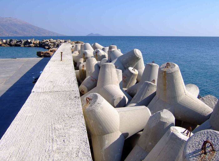 «Тетрапóд». Впервые тетраподы были изобретены во Франции в 1950 году и были применены для защиты забора морской воды в Марокко на тепловой электростанции, расположенной в городе Касабланка.