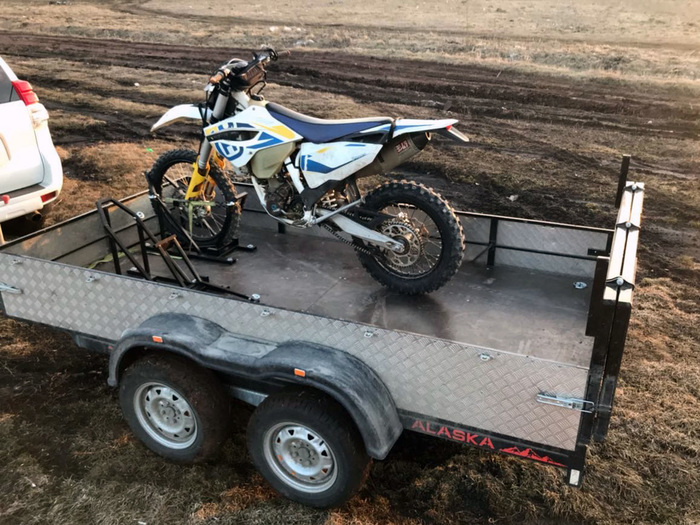 Упор переднего колеса мотоцикла с захватом имеет название «мотокапкан». После фиксации колеса в мотокапкане, мотоцикл фиксируется в прицепе с помощью стяжных ремней.