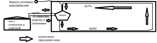 Так как навоз имеет среднюю температуру гниения 60-70°С, при циркуляции воды из ямы и обратно она будет постепенно нагреваться, в последствии обогревая все помещение в целом. При этом учитывается и тот факт, что температура земли в Омской области при глубине от 1.5 метра составляет порядка 7-8°С, поэтому данная схема будет работать не только от выделяемого навозом тепла, но и от неиссякаемого источника тепла- земли. А насос будет выполнять равномерную циркуляцию воды по всему периметру прокладки труб.