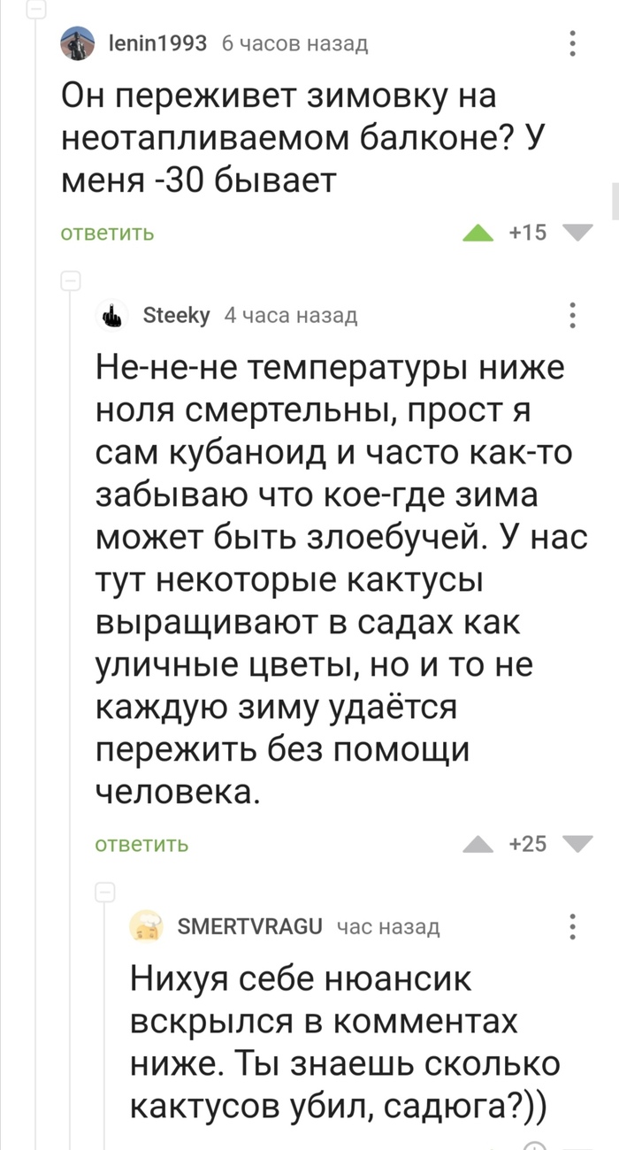 10 URAGANN86 Скриншоты комментов Кактус как кактус 4 года назад #comment_196210986 Скриншот Комментарии на Пикабу Кактус Юмор Ещё 0