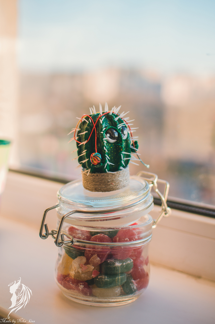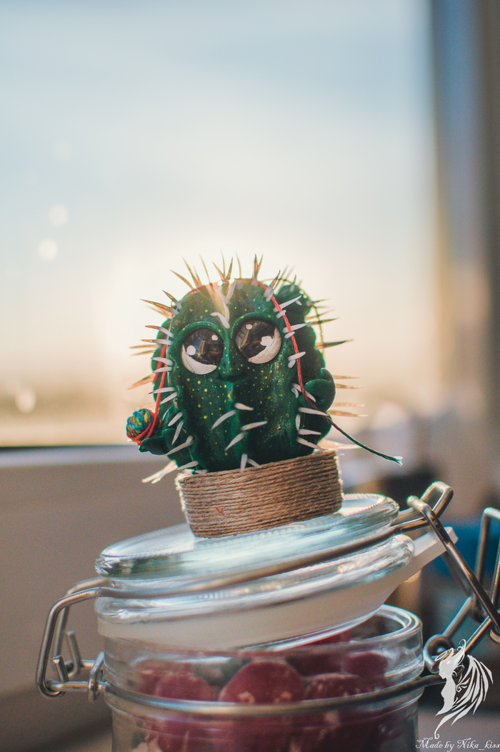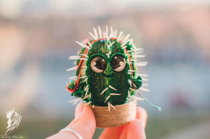 Делался малыша в несколько этапов: сначала накатала много-много иголок, запекла; потом роспись глазок вручную; далее сделала каркас, сформировала нужную форму; потом вклеила глаза и начала вставлять иголки; потом полное запекание; затем обезжиривание, роспись, покрытие лаком; и в финале вклеила кактусёныша в задекорированный "горшочек". Все!